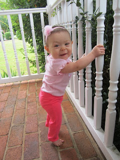 She can walk with a walker (but prefers pushing kitchen chairs).